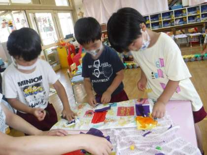 出来上がった飾りたちが風に揺れると「きれいだね」と大喜びの子どもたち♪「私のはこれ!」「かわいいね!」と、お友達と見せ合いっこもしていましたよ。