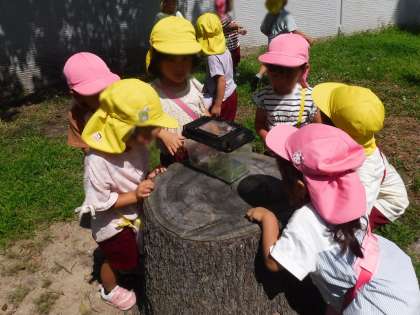 2回目のきく組は、「ここらへんにいそう」「ぴょんってなったとこにおるで!」と、経験をいかしながら探していました。もも組はきく組の姿を見ながら、一緒に草むらをきょろきょろしたり、きく組が捕まえたバッタを「触りたい!」と触らせてもらったりして楽しんでいました。たくさん捕まえて満足そうでした^^