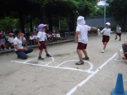 青チームvs白チーム。チームの中で走る順番を相談したり、絶対勝つぞ!と掛け声をかけたりして、友達と力を合わせて頑張りました。