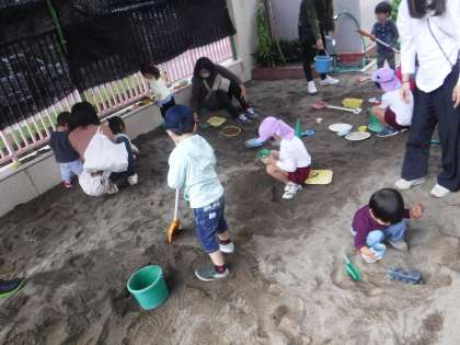 5歳児(ふじ組)さんが一緒に、砂場や園庭で楽しく遊びました。