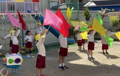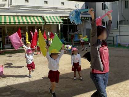運動会の活動を見合いっこしていた、きく組・もも組の子どもたちが、ふじ組さんを真似てフラッグを揺らして踊っています。