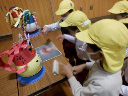 いろいろな作品を見て興味津々!「これどうやってつくったんかな?」「幼稚園でつくったやつと似てる!」「これは絵の具で描いてるね」と、発見したり、考えたりしていました。
