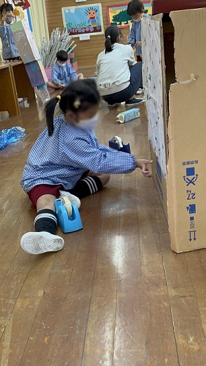 「ちょっとここ持っといて!」「これ残り使う?」「ここはこうしたらいいんちゃう?」と友達と助け合いながらつくっていました。