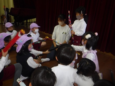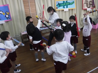 話し合いを経て「体に当てたら痛いから、如意棒だけに当てて遊ぼう!」と遊びの中での約束も自分たちで考えました。