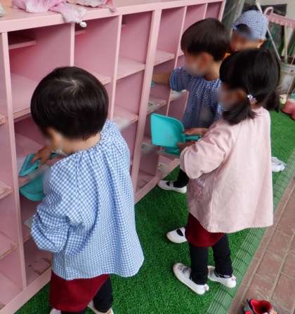 3歳児もも組さんは、自分のロッカーや靴箱、お部屋のおもちゃを雑巾でふきふき〜♪