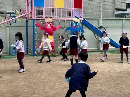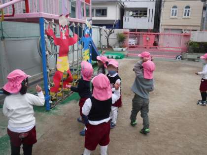 今日は園庭の遊具のところに大きな鬼の貼り紙が!