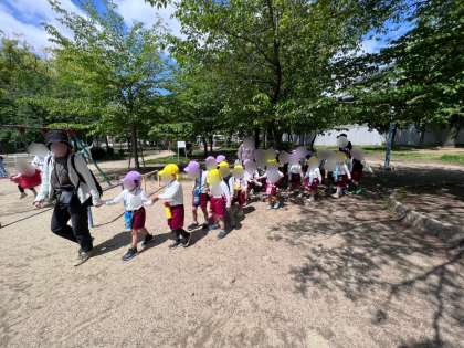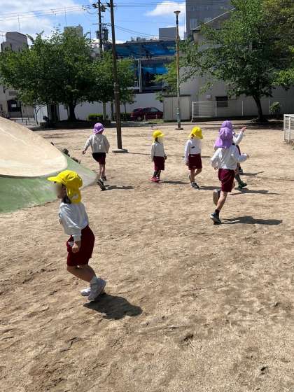 明日、園外保育に行く予定のきく組さん(4歳)とふじ組さん(5歳)が、歩き方の練習を兼ねて隣の東小橋公園へ遊びに行きました♪