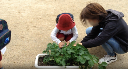 登園時から「イチゴ赤くなってる〜」と大喜びのもも組(3歳児)さん!