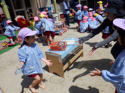 シャボン玉コーナーでは大きなシャボン玉作りに熱心な子や、できたシャボン玉を追いかける子で大盛り上がり☆