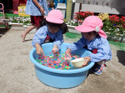 スーパーボールすくいコーナーでは、気に入ったボールを集めて“たらい”のお水で気持ちよさそうに遊んでいました!