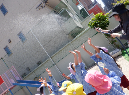 暑さでカラカラに乾いた園庭で、熱中症にならないように先生がお水を撒くと、かけてほしい子たちが両手一杯広げて水滴を浴びていました♪