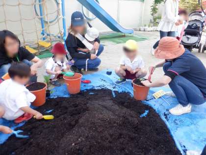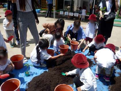 今日は、ふじ組・もも組が親子で夏野菜の植え付けを楽しみました。