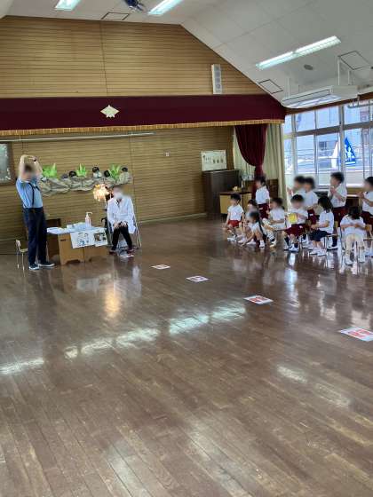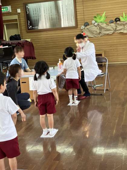 もも組(3歳児)にとっては幼稚園で受ける初めての検診にドキドキしていましたが、ふじ組(5歳児)が手本を見せてくれたり、横について手をつないでくれたりしました。