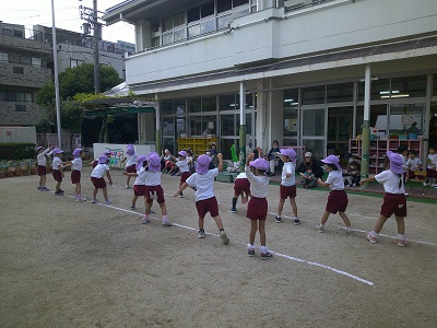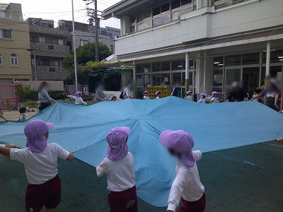 その後ふじ組、ひよこランドのお友達、おうちの人、みんなで一緒にパラバルーンをしました。