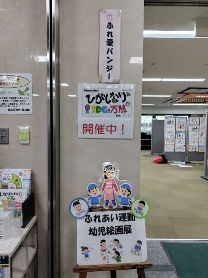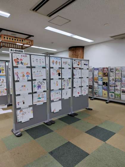 チンドンバンドさんや教えてもらった挨拶をしている様子をかいた絵を区役所の一階に展示しています。