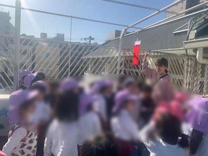 ぽかぽかの天気の中、全クラスで園庭で遊んでいると「なにあれ?」と、プールの方を指さす子どもたち。「なんかある!」「サンタさんの絵書いてるで!」と大興奮!すぐに周りの友達にも知らせて、みんなで見に行くことにしました^^