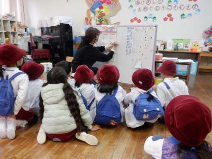 リズム室で園長先生のお話を聞いたり、年長児ふじ組は「あと何日幼稚園で遊べるかな?」とみんなでカレンダーを見て修了までの日にちを数えたりしました。今年度の締めくくりの学期、楽しいことをいっぱい計画して、充実の幼稚園生活を過ごしていきたいと思います。