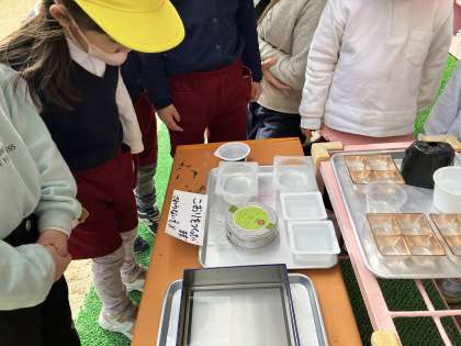 近畿地方でも雪マークの天気予報。風が冷たい日ですが、子どもたちは元気に園庭に出て遊んでいます。
