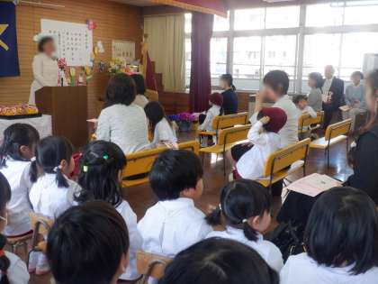 4月10日に入園式が行われ、3歳児もも組15人と4歳児きく組1人が、新しく東小橋幼稚園のお友達になりました。最初は緊張気味だった子も、お兄さんお姉さんからのお祝いの言葉や歌を聞いているうちに、表情も和らいできたみたいです。