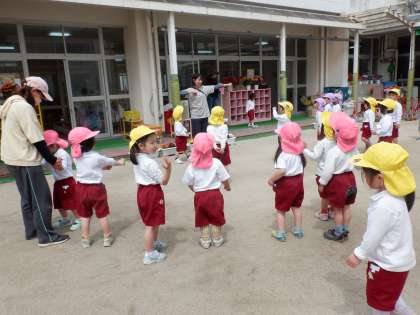 今日はみんなで集会もしました。「どうぶつたいそう1・2・3」や「地球ぴょんぴょん」というダンスを一緒に踊りました。