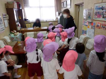 その後ふじ組さんにも付き添ってもらいながら、園長室や保健室も探検して、もも組のお部屋に戻りました。