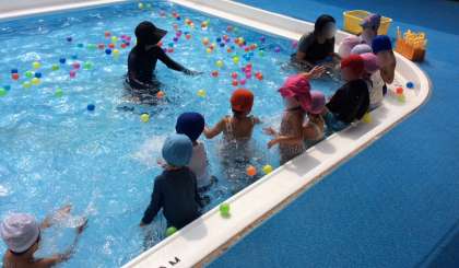 朝から元気いっぱいの子どもたちは、「今日もプールだ!!」と言って登園してきました。