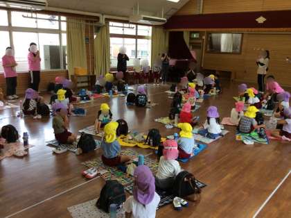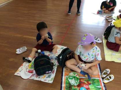 遠足ごっこ♪ 公開日 2025/09/12 更新日 2025/09/12 異年齢 今日は今度の遠足に向けて、みんなで一緒におにぎり弁当を食べる遠足ごっこを行いました! ふじ組がもも組きく組に「こっちで食べよう」と声をかけている姿が見られました。またごちそうさまの後には、レジャーシートの畳み方をひとつひとつ丁寧に教えているかっこいい姿も見られました! 遠足でも仲良くおいしいお弁当食べようね♪ いいね(0)