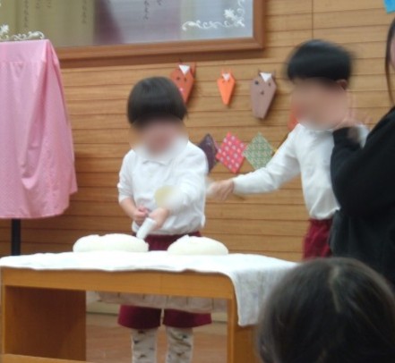 「みんなが元気に幼稚園で過ごせますように」「けがをしないで過ごせますように」と願いを込めながら、鏡開きをしました。