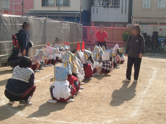 地震が起きたときには、先生のお話をよく聞いて身を守り、その後はみんなで園庭まで避難しました。子どもたちは落ち着いて行動し、上手に避難することができました。