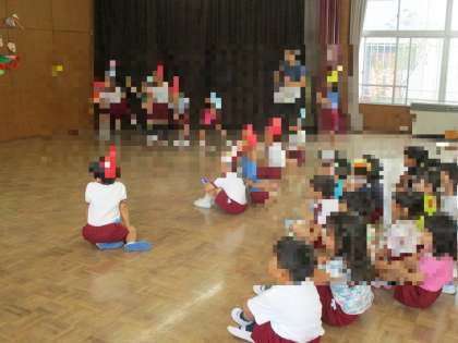 今年度から子どもたちが『チャレンジはかせ』になってお祝いのプレゼントをします。今回は、そら組が『チャレンジはかせ』になって『紙ひこうき』のつくり方をみんなに教えてあげました!『チャレンジはかせ』をするために、そら組の子どもたちは、何度も話し合いをし、考えを出し合いました。そのおかげで、誕生会は大成功でした!