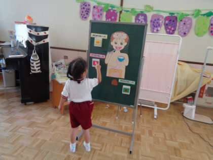 4・5歳児には『ねこすけくん なんじにねたん?』という絵本を読んで、「はやね・はやおき・あさごはん」の大切さを伝えました。5歳児には就学に向けて、何時までに起きて、何時までに寝るとよいかという話も、時計を用いて話しました。