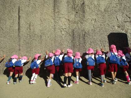 はな組あか組は、お城の下から「そら組さーん!」と手を振ったり、大きな石垣を押したり、どんぐり拾いをしたりして楽しく遊びました!