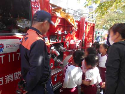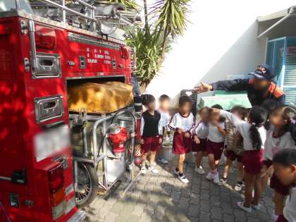 今回は消防署の方にも来ていただき、『お・は・し・も』の約束を確認したり、消防車を見せていただいたりしました。消防車に興味津々の子どもたち!たくさん質問をして、消防車や消防士さんについて知ることができました。