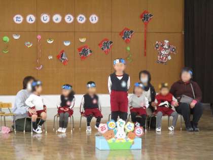 かんむりをかぶった誕生児は、へびのたこを持って入場しました!1つ大きくなった子どもたちは、大きな声で自己紹介をした後、お家の方からメッセージ、園長先生からプレゼントをいただき、笑顔があふれていました。お祝いはまだまだ続きます。3歳児(あか組)からは手作りの『くるくるだこ』をもらい、5歳児(そら組)からは『こすれこすれ』という遊びを教えてもらいました。みんなでふれ合って遊び、体も心も温まりました♪