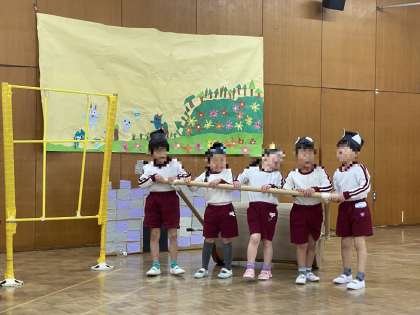 4歳児はな組は、カスタネット、スズ、タンブリン、トライアルアングルに分かれ、曲に合わせて楽器をならしていく楽しさを感じていました。劇遊び「17ひきのねこ ふくろのなか」では、毎日役を交代し、役になりきって遊ぶ楽しさを味わっていました。