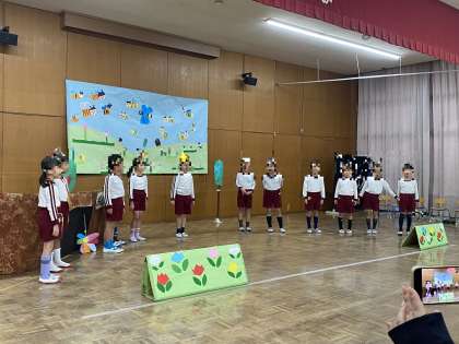5歳児そら組の歌声はとてもきれいで会場に響き渡っていました。合奏「エンターテイナー」では、1人1人が自信をもって演奏し迫力のある合奏となり、会場中からアンコールもいただき、子どもたちもとても嬉しかったようです。みんなでこうしてみよう、ああしてみようと作り上げていった劇遊び。子どもたちが力を合わせて取り組んでいる姿はまさに「みつばちマーヤの冒険」そのものでした。