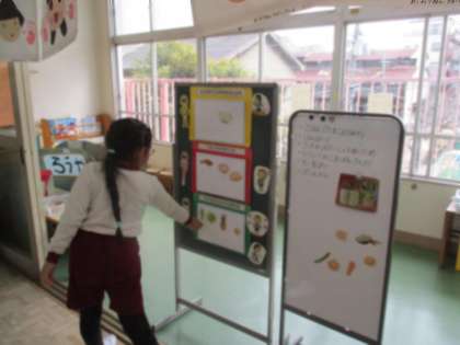 「ご飯やパンなどは黄色レンジャーに変身して、体を動かす力になること」「肉や魚などは赤レンジャーに変身して、強い体をつくること」「野菜や果物などは緑レンジャーに変身して、病気から体を守ること」を伝えました。そして、レンジャーたちは3人そろわないと力が出ないので、3人そろうように(バランスよく)食べましょう!と話をしました。