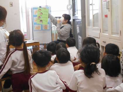 次に、うがいについてもお話ししました。のどについたばい菌を落とすためには、上を向いてしっかりとがらがらうがいをすることが大切だというお話をしました。