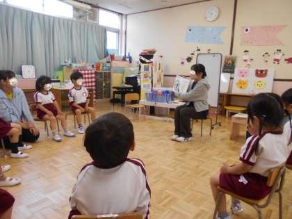 5月の保健指導では、養護教諭から手洗いうがいについて3・4・5歳児それぞれにお話ししました。手には、目に見えないばい菌がついていることや、外で遊んだ後やトイレの後、ご飯を食べる前などに手を洗うことを確認しました。その後『あわあわてあらいのうた』で音楽に合わせて手洗いの6つのポーズを一緒にやってみました。4・5歳児さんは前に教えてもらったことをよく覚えていて、一緒に歌いながら進んで手洗いのポーズをやっていました。3歳児さんたちも、先生と一緒にひとつひとつ確認しながら、上手にできていましたよ。
