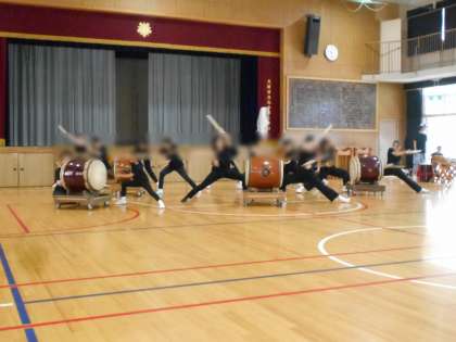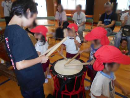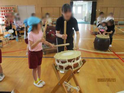 PTA主催で、小学校の講堂をお借りし、地域の和太鼓クラブ『飛童』さんが和太鼓の演奏を披露してくださいました。飛童さんは、大阪城の豊國神社に奉納太鼓をされたり、大阪・関西万博でも演奏を披露されたりしています。体に響く迫力ある演奏に子どもたちも聴き入っていました。その後は、太鼓の体験もさせていただき大喜びをしていました。とても良い経験になりました。5歳児そら組が、今日の経験を活かし運動会で和太鼓に挑戦します!