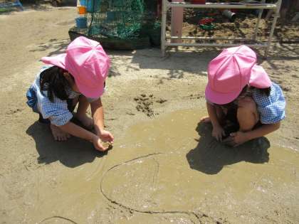 園庭では、スーパーボールすくいや、水てっぽう、泥遊び、色水遊びなど、