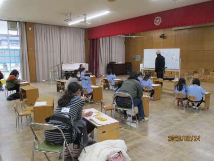 2月24日、そら組さんとお家の方が、かきかた教室に参加しました。北中道地域で書き方や書道を教えておられる、書道家の先生をお招きして、字をバランスよく書くことや、美しい文字を書くコツなどを教えていただきました。はじめは緊張していた子どもたちでしたが、書いている様子を先生に褒められたり、お家の方に「うまいやん!」と認めてもらったりするうちに自信がつき、たくさん文字を書いて、文字に興味をもつきっかけとなりました。