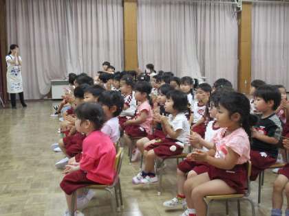 なぜ手洗いをするのか、どんな時に手洗いをするのか確認した後、「あわあわ手洗いの歌」に合わせて楽しく手洗いの練習をしました♪