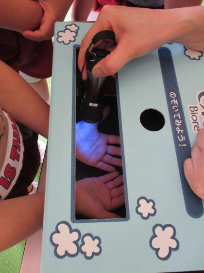 4・5歳児の子どもたちは、手の洗い残しがわかる手洗い実験もしました。汚れが残っているところがわかってびっくり!「1回できれいにできたよ!」と教えてくれる子どもたちもいました。