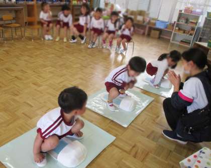 和式トイレの模型を使って、みんなで「カエルのポーズ」!