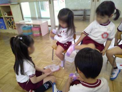5歳児そら組のお兄さん、お姉さんがお手本を見せてくれたり、お着替えを手伝ってくれたりしましたよ。