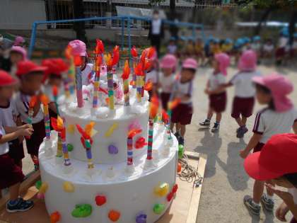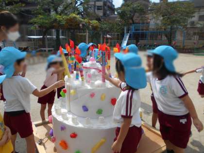10月1日は、幼稚園の創立記念日。60周年を迎えました。誕生日を迎える前に5歳児そら組の子どもが誕生日ケーキをつくってくれました。そのケーキが、なんと次の日に大きく変身していました!今日は、大きくなったケーキに、子どもたちがつくったローソクを差し、みんなでお祝いをしました!保護者の方のご協力や地域の方に見守っていただき60周年を迎えることができました。これからも、子どもたちの笑顔があふれる幼稚園でありたいと思います。