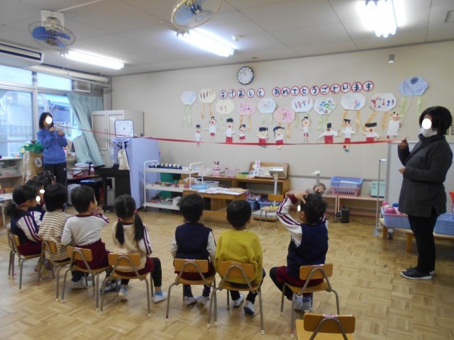 かぜ菌をもらわない・広げないためには、こまめな手洗いうがいのほかにも、鼻水を上手にかむことや、咳エチケットに気を付けることなどを話し、みんなで真似をしてやってみました。4・5歳ではお部屋の換気パトロールもお願いしました!