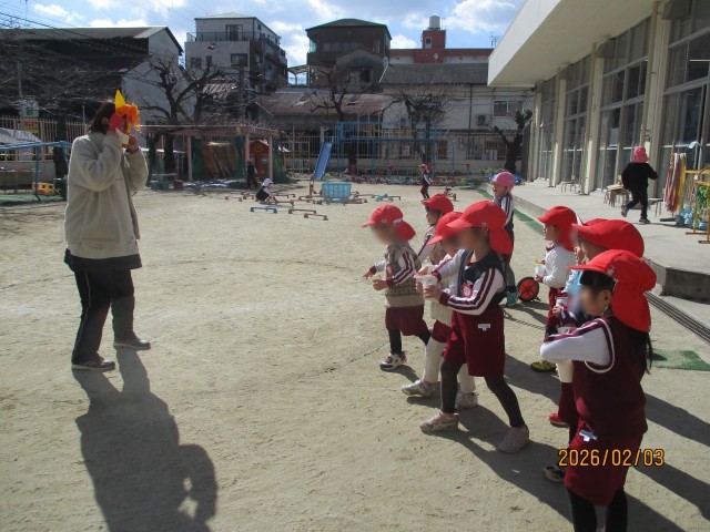 2月3日は節分。節分の話を聞いたり、絵本を見たりして由来を知り、豆まきをしました。各学年、豆入れをつくり、いざ豆まき!!「鬼は外!福は内!」と大きな声が園庭に響きました。心の中の『泣き虫鬼』『怒りんぼう鬼』『野菜嫌い鬼』などを追い出し、心が軽くなりました☻これからも元気に幸せに過ごせますように!
