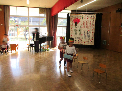 果物かんむりをかぶった誕生児は、電車に乗って入場しました!自己紹介はとてもドキド...